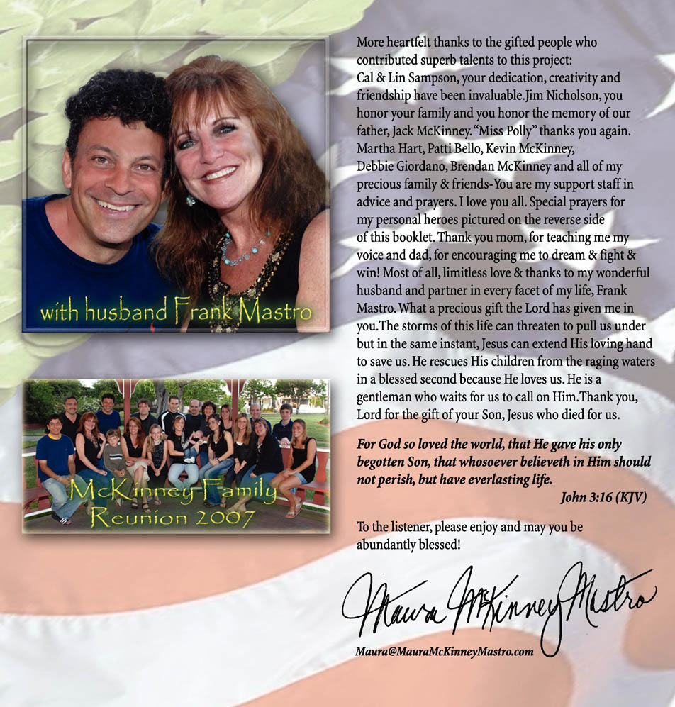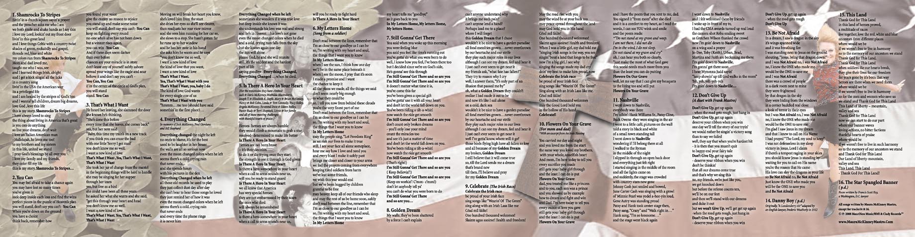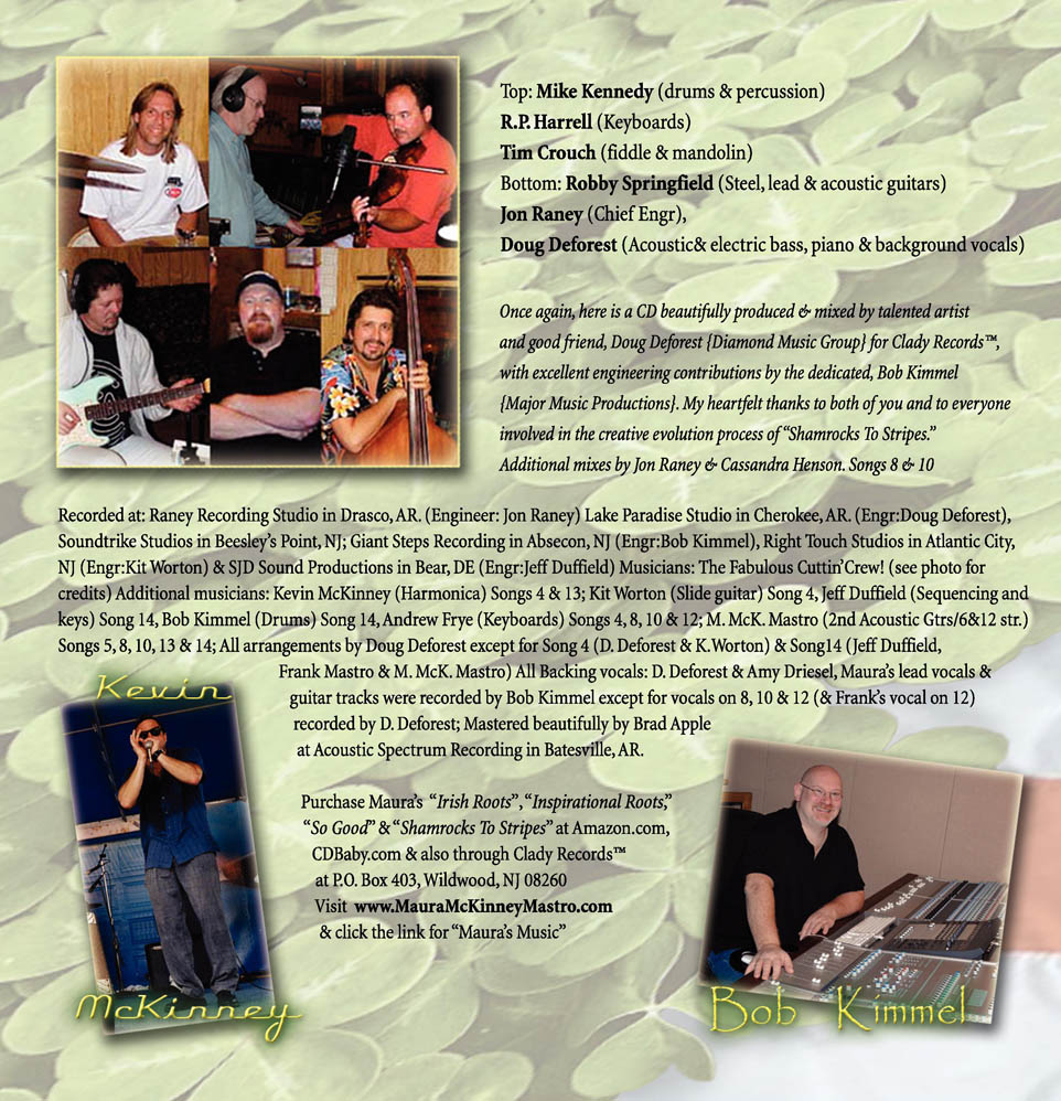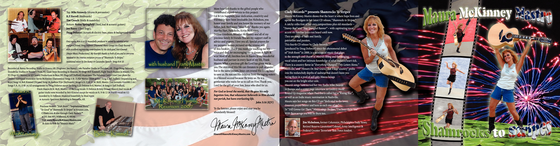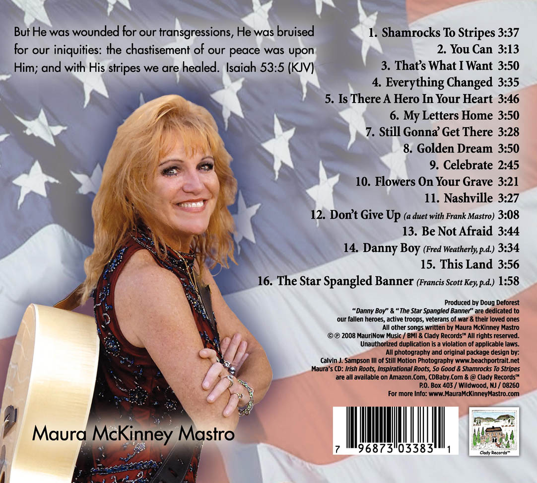 Maura McKinney Mastro's newest Clady Records release, "Shamrocks To Stripes" is an exciting & contemporary collection of original Celtic, Country, Gospel and Patriotic songs plus 2 standards - "Danny Boy" and "The Star Spangled banner" _ (with captivating vocal accent on familiar lyrics not heard until now) and this fabulous 16 song CD tells a story of faith, family, patriotism and passion in the strength and charm of Maura's lilting and far ranging vocal talent!